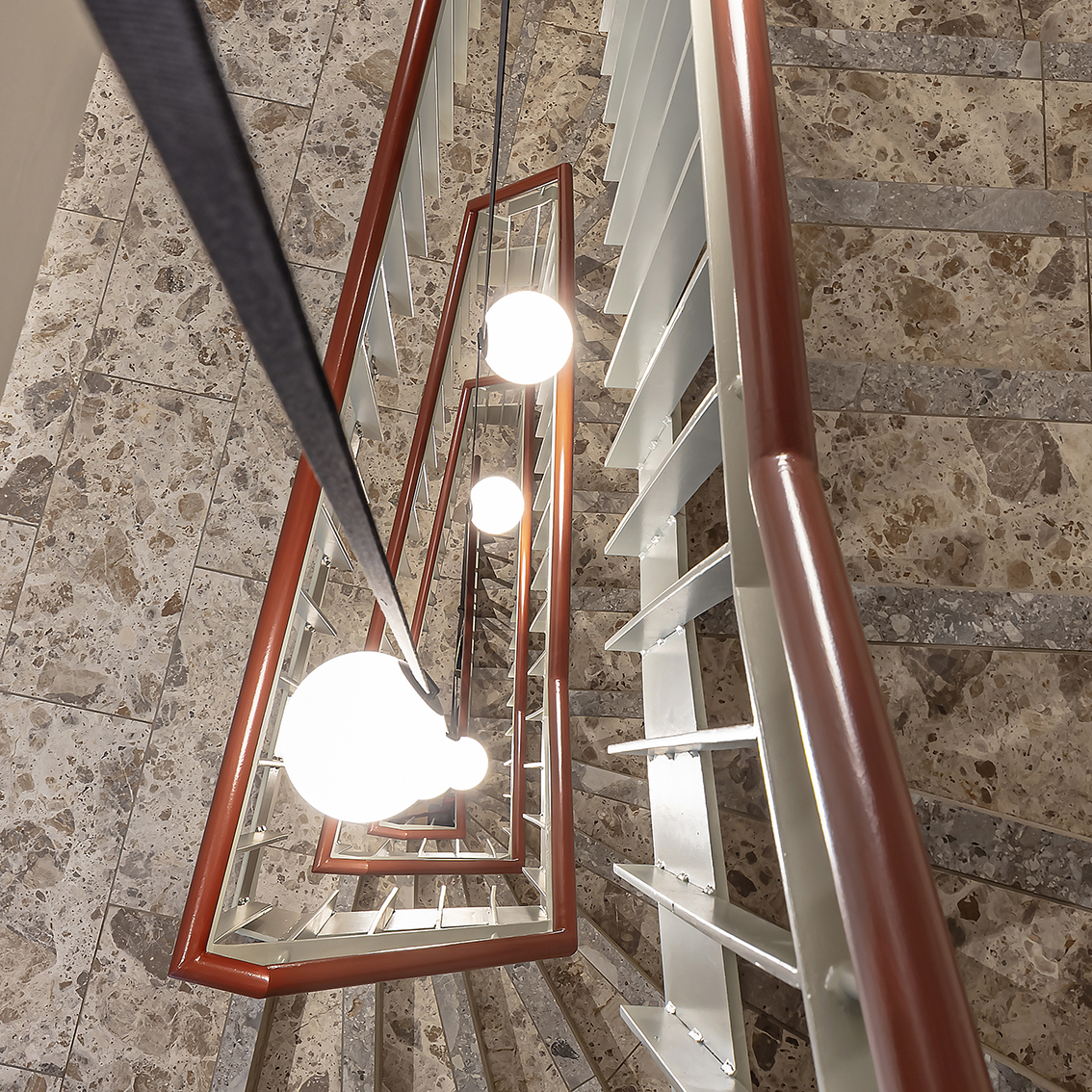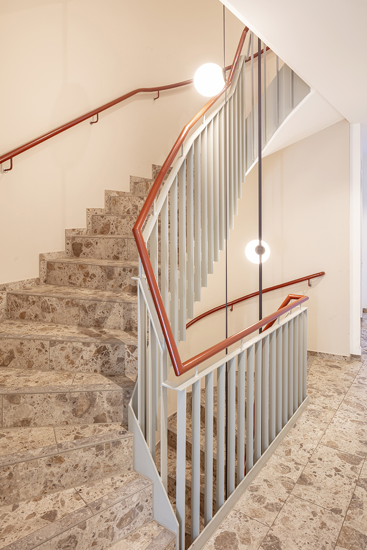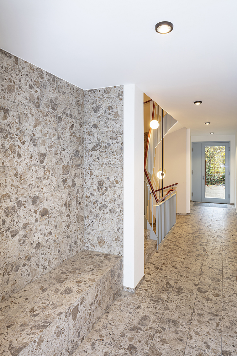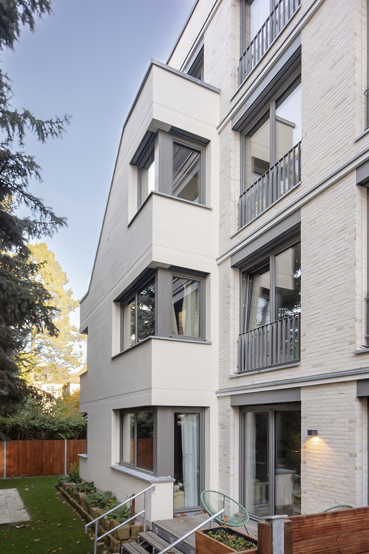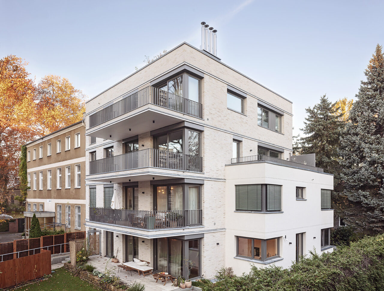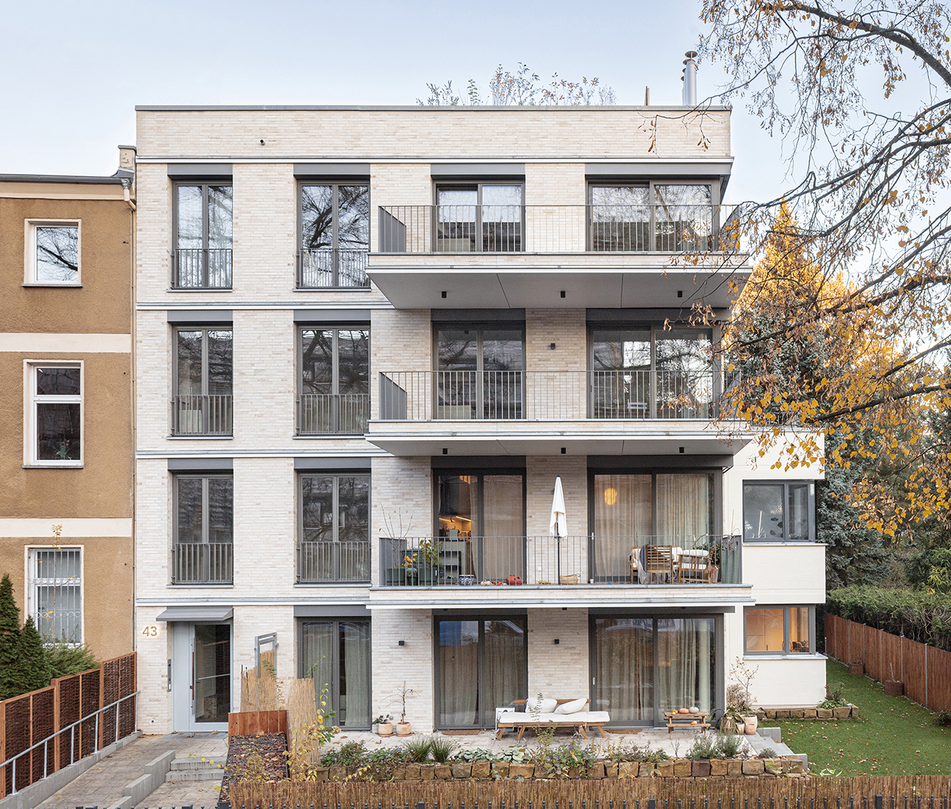 In wunderbarer Lage nahe am Schlosspark realisierte sich eine Baugruppe ihre individuellen Vorstellungen vom Wohnen. Der Bau fügt sich mit seiner hellen Klinkerfassade und in seiner Größe gut in die Umgebung ein. Ein freundliches Entree mit Verweilmöglichkeiten schafft gute Voraussetzungen für die Kommunikation. Eine an zwei Strängen hängende Designerleuchte erhellt das Treppenhaus gleichmäßig von oben bis unten. pfeiferstudio.de