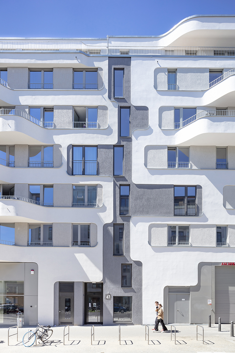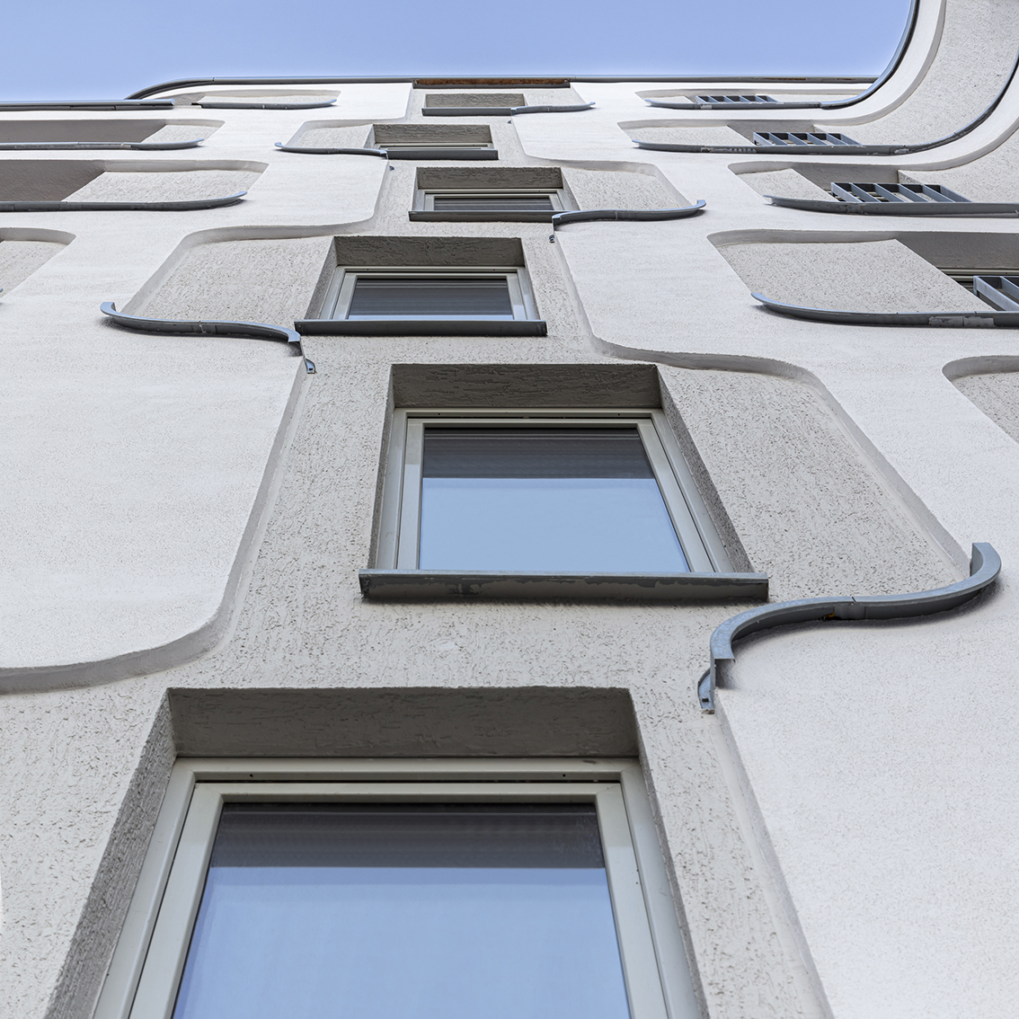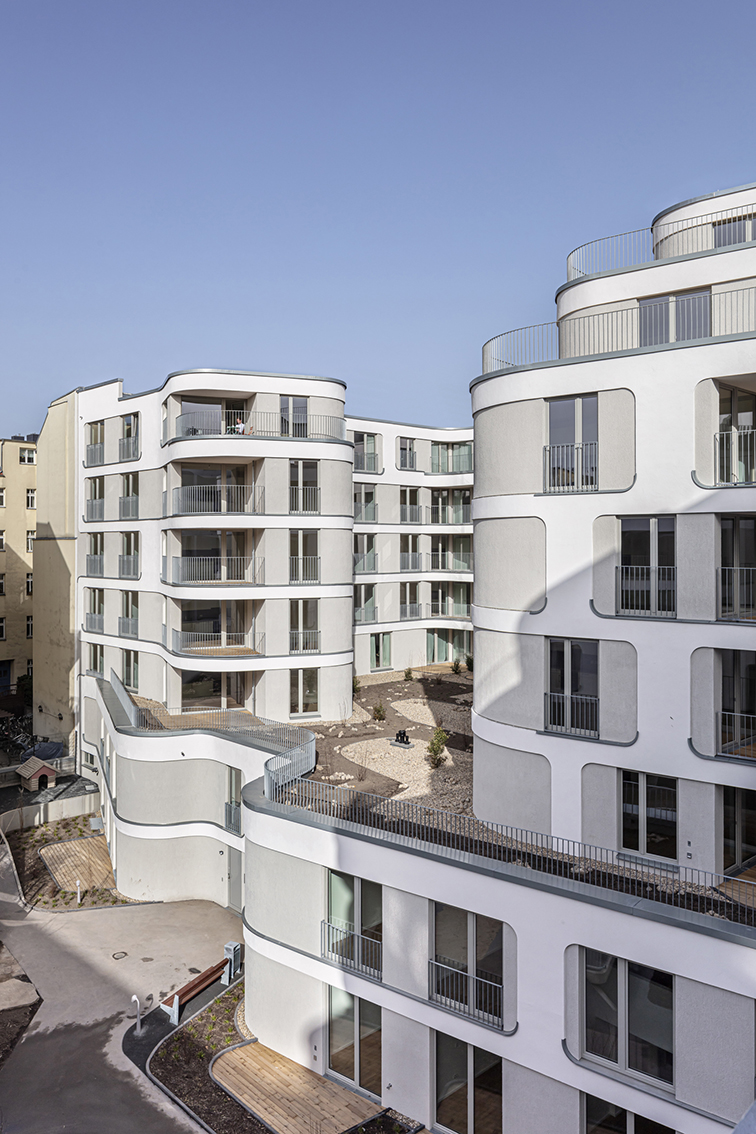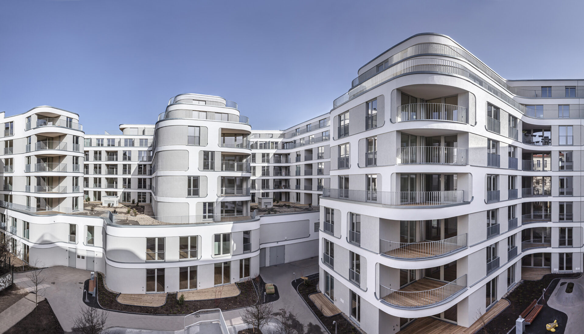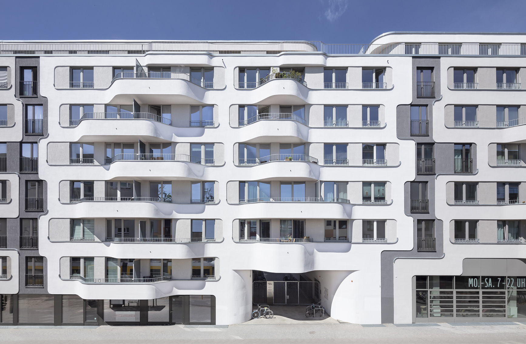 Auch hier wurde viel Wohnraum geschaffen durch die Überbauung eine Supermarkts mit Parkplatz in wertvollster Lage. Der Supermarkt ist heute im EG und 1. OG integriert, darüber finden sich Gartenflächen für die Bewohner.
