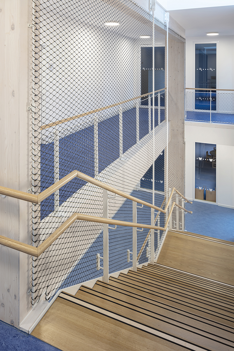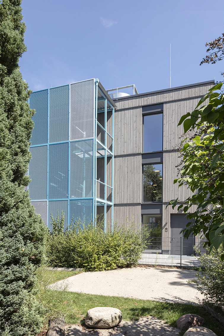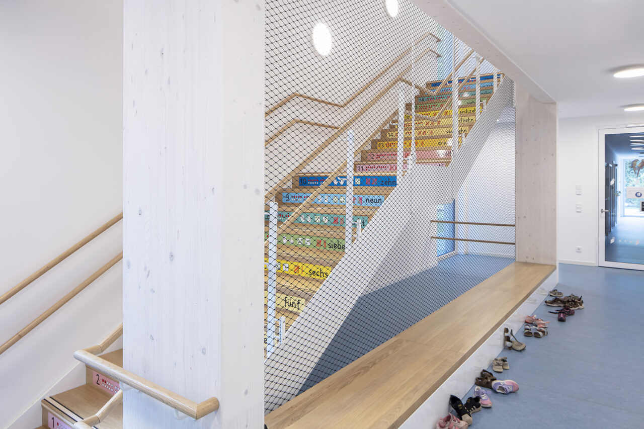 Eine Kindertagesstätte in Holzbauweise mit vorgestelltem Laubengang in Stahlkonstruktion – eine von mehreren KiTas, die in Modulbauweise errichtet wurde.