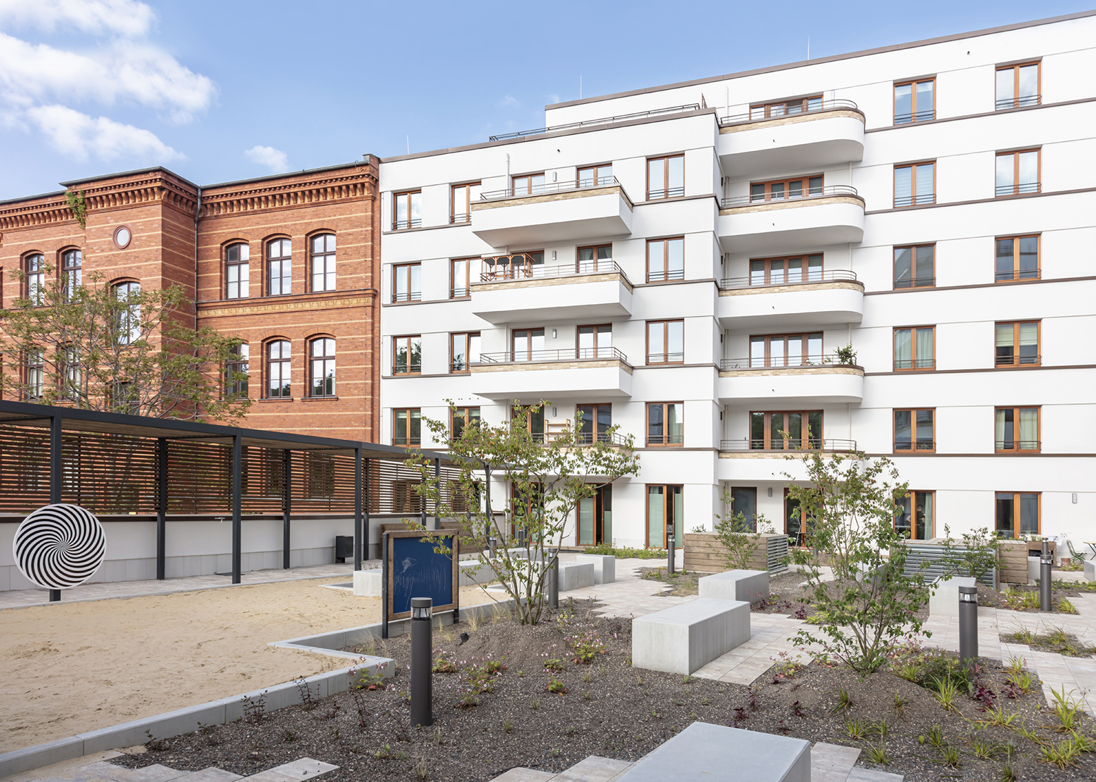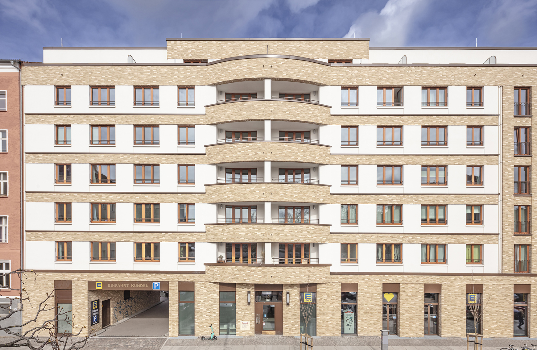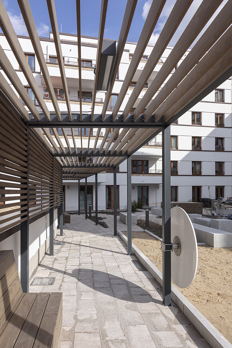 Über der Fläche eines ehemaligen Supermarkts mit Parkplatz, der jetzt im Erdgeschoss integriert ist, entstanden Wohnungen, die von einem schönen Hochgarten über der jetztigen Supermarktfläche profitieren.
