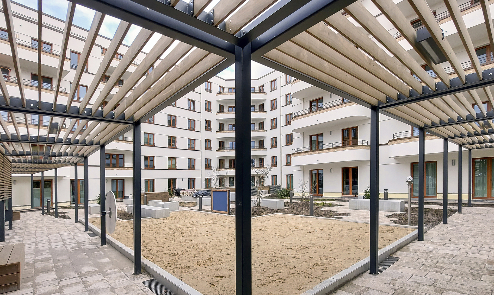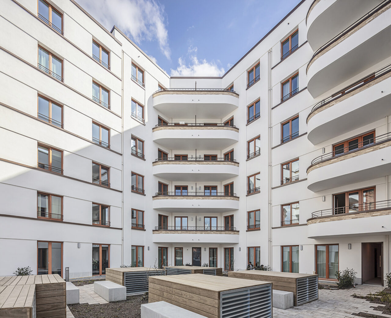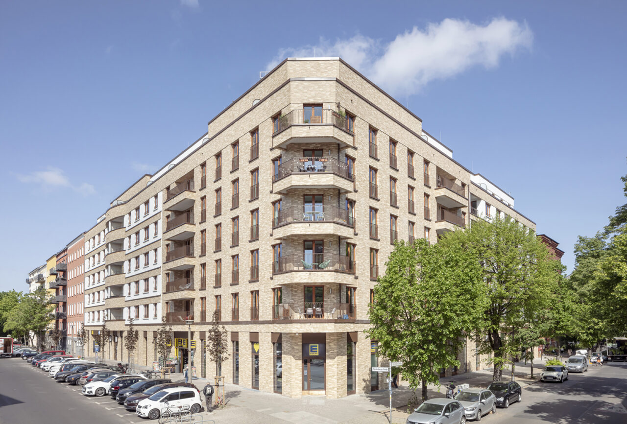 Über der Fläche eines ehemaligen Supermarkts mit Parkplatz, der jetzt im Erdgeschoss integriert ist, entstanden Wohnungen, die von einem schönen Hochgarten über der jetztigen Supermarktfläche profitieren.