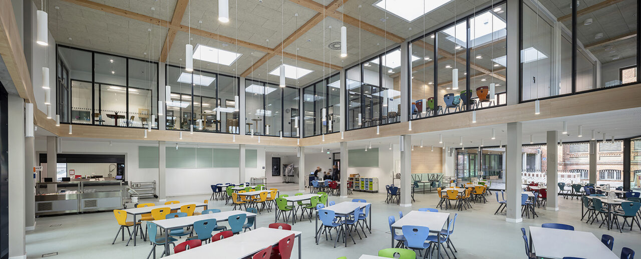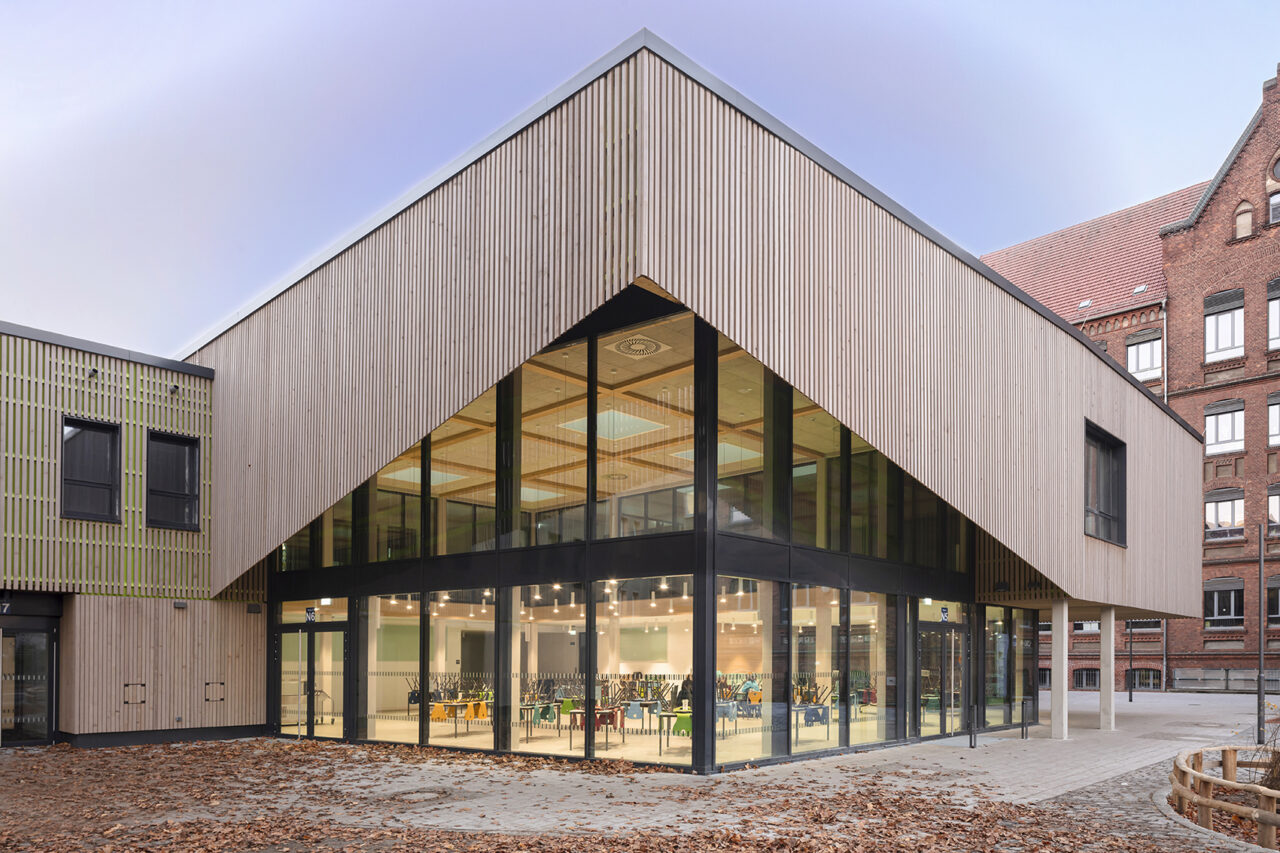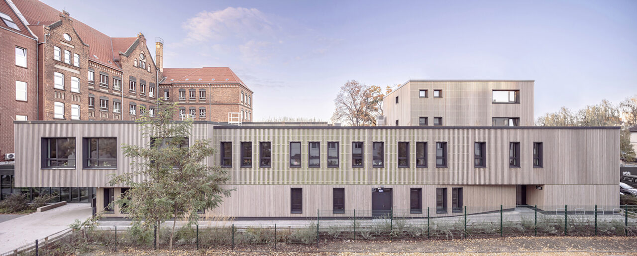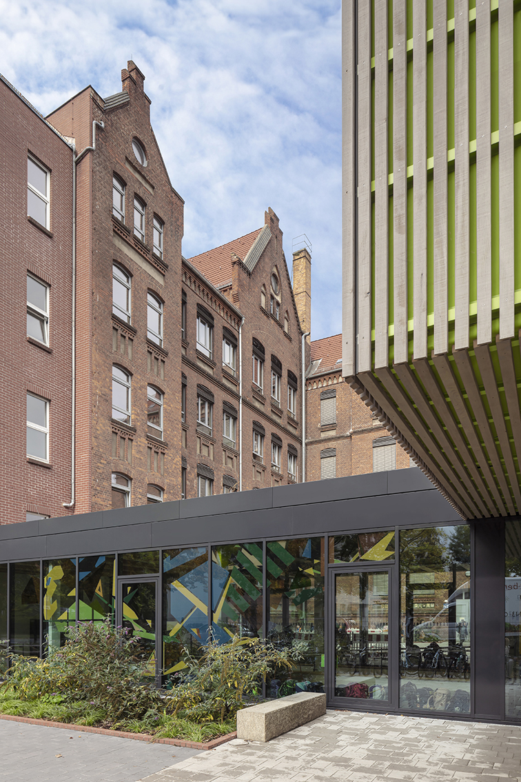 Anbau an historischen Klinkerschulbau mit Verwaltungsflächen und Mensa. Ehemalige Ho Chi Minh-Schule.