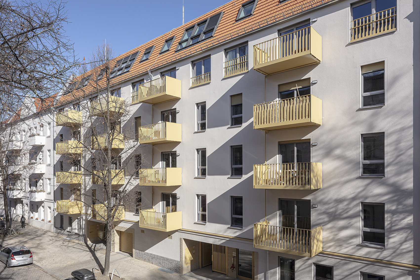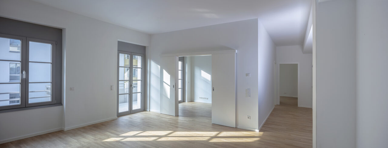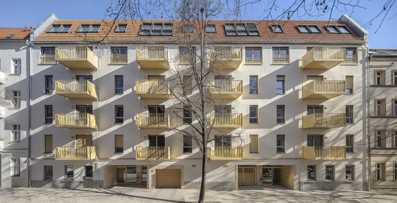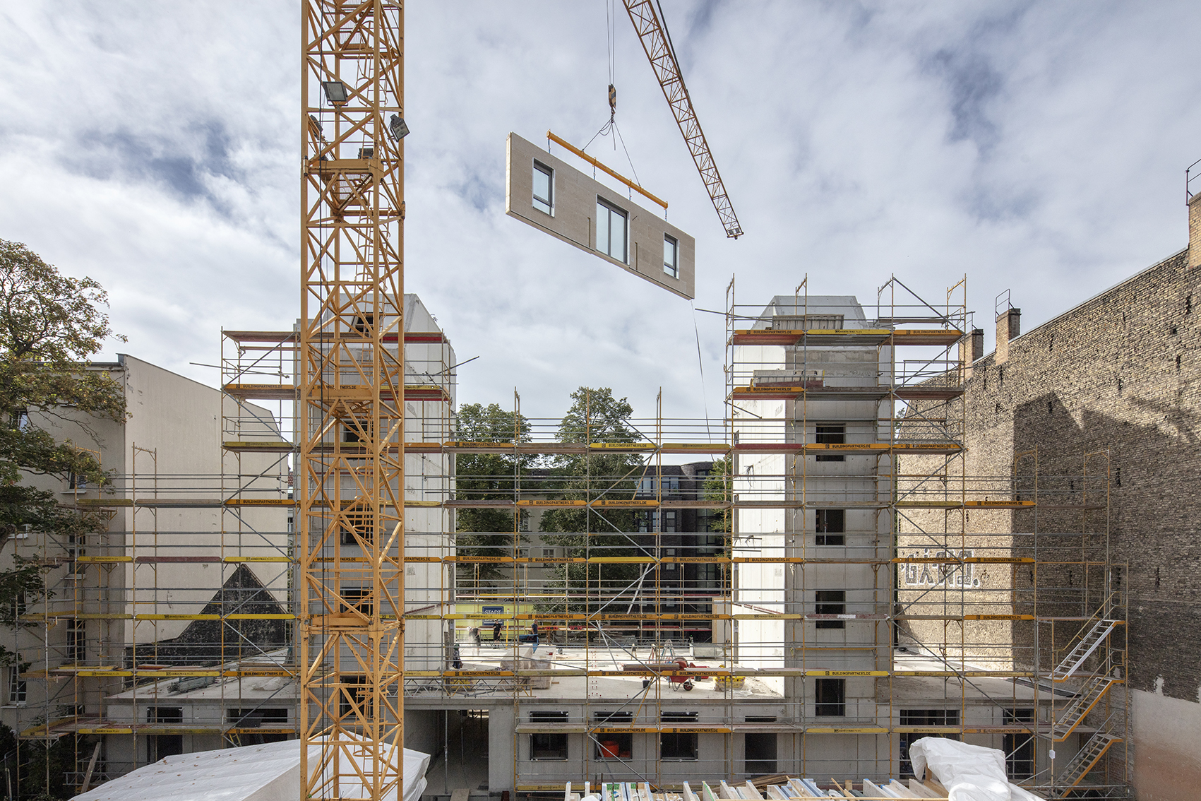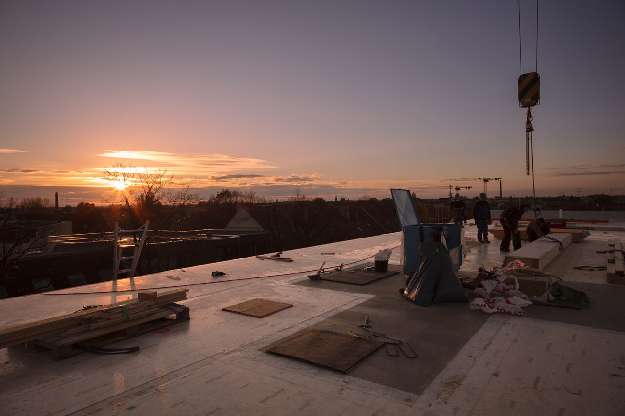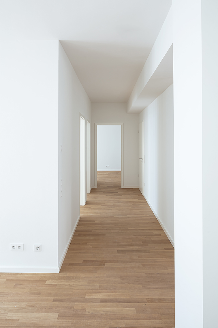 Ein Haus in reiner Holzkonstruktion. Außer den Erschließungskernen und dem Erdgeschoss wurden alle Wände und Decken mit vorgefertigten Holzelementen in Schichtholzkontruktion errichtet. Neben ökologischen Aspekten ermöglichte das auch einen rasanten Baufortschritt, so dass der Rohbau in wenigen Wochen fertiggestellt werden konnte. Projektentwickler war die Holzunion GmbH.