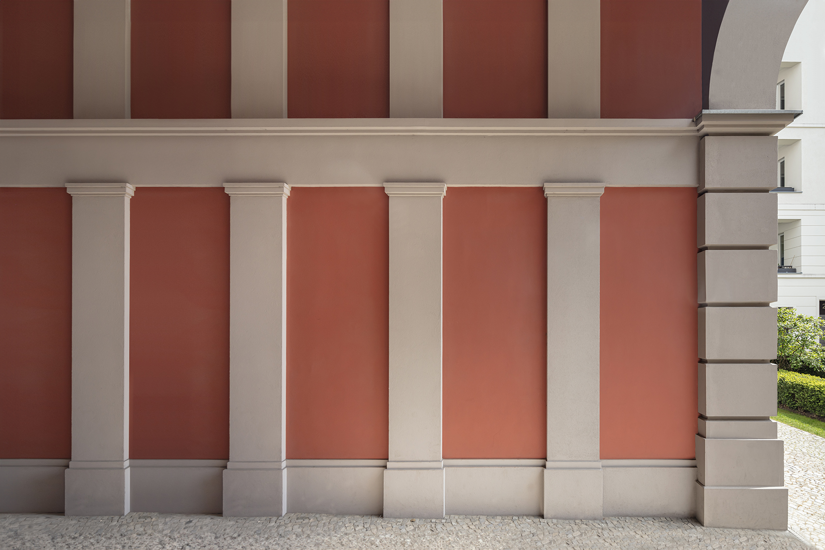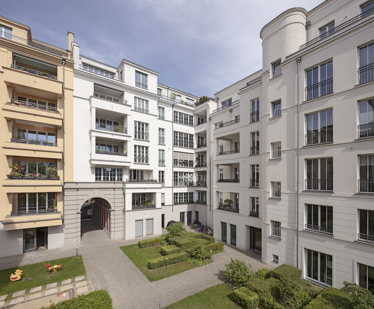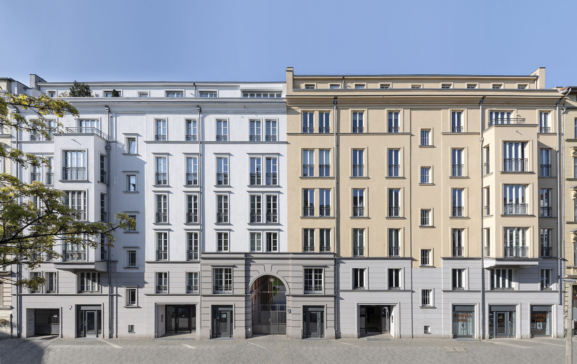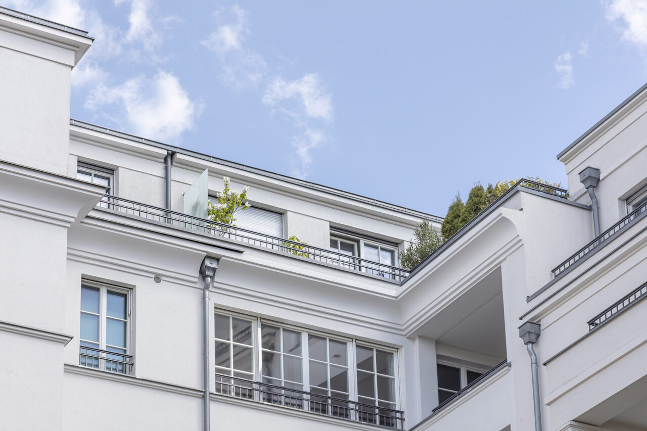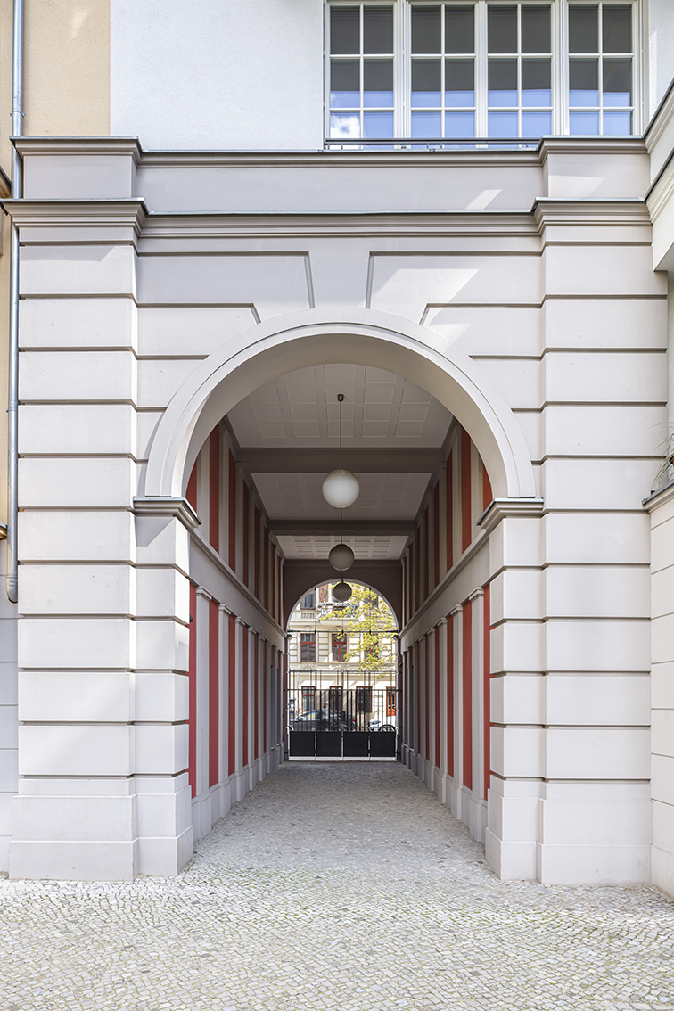 Die Fassadengestaltung der Häuser orientiert sich an dem überwiegend denkmalgeschützten Umfeld. Die Dreiteilung der Straßenfassade nimmt die Struktur der historischen Umgebung auf.