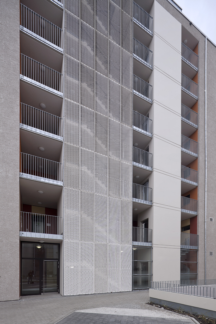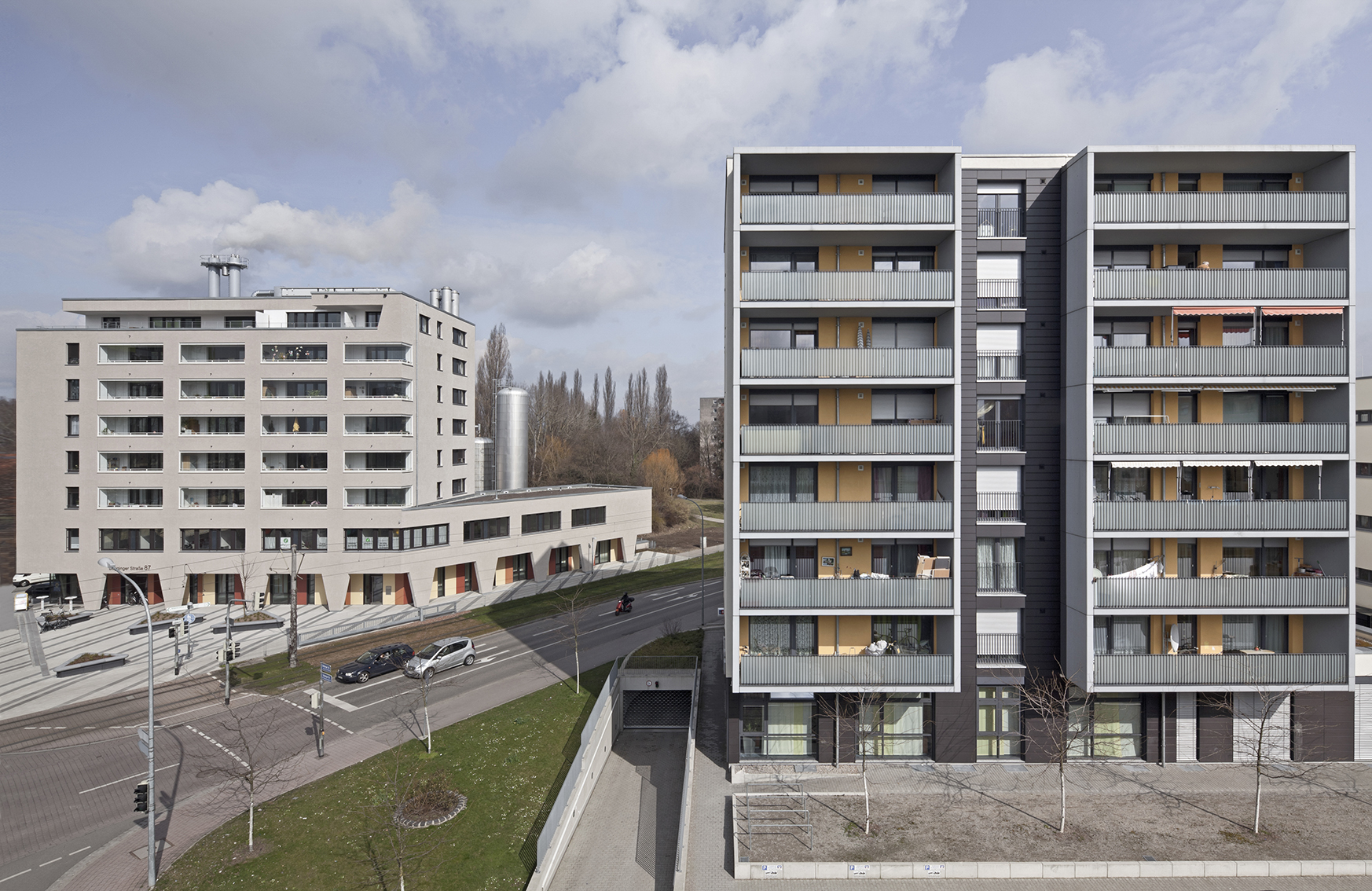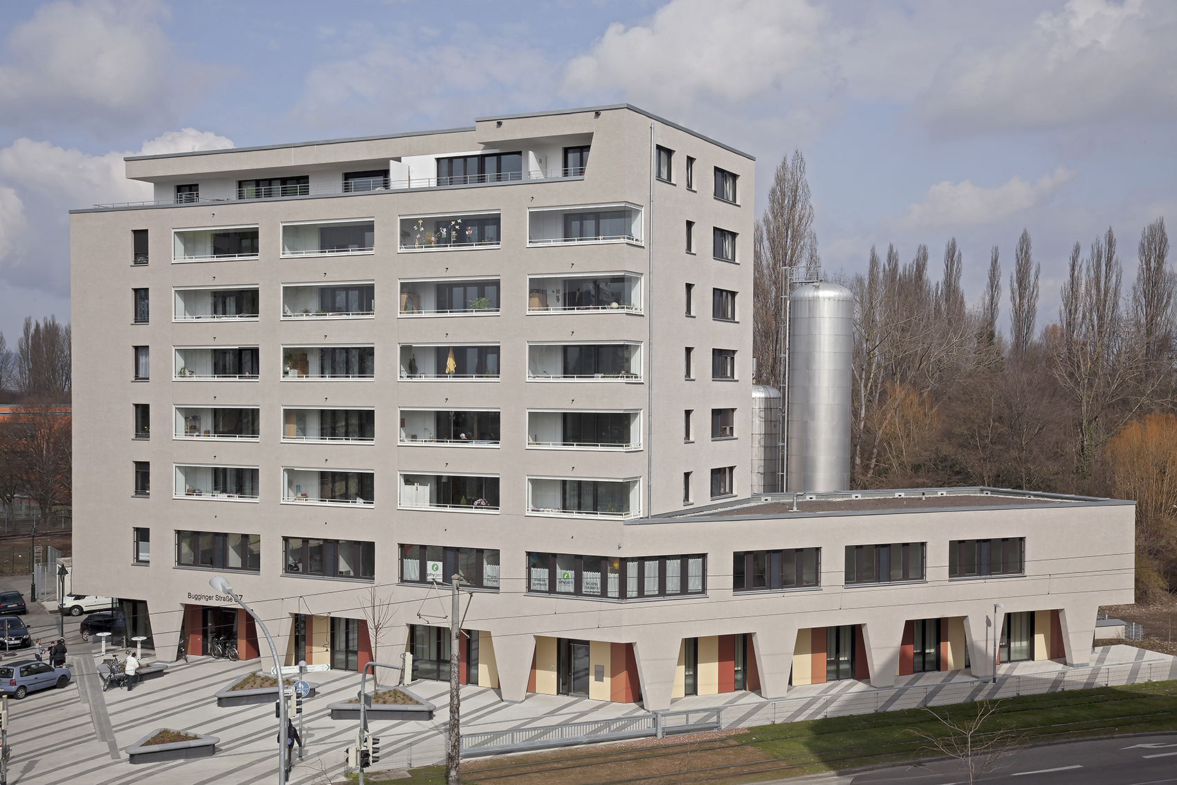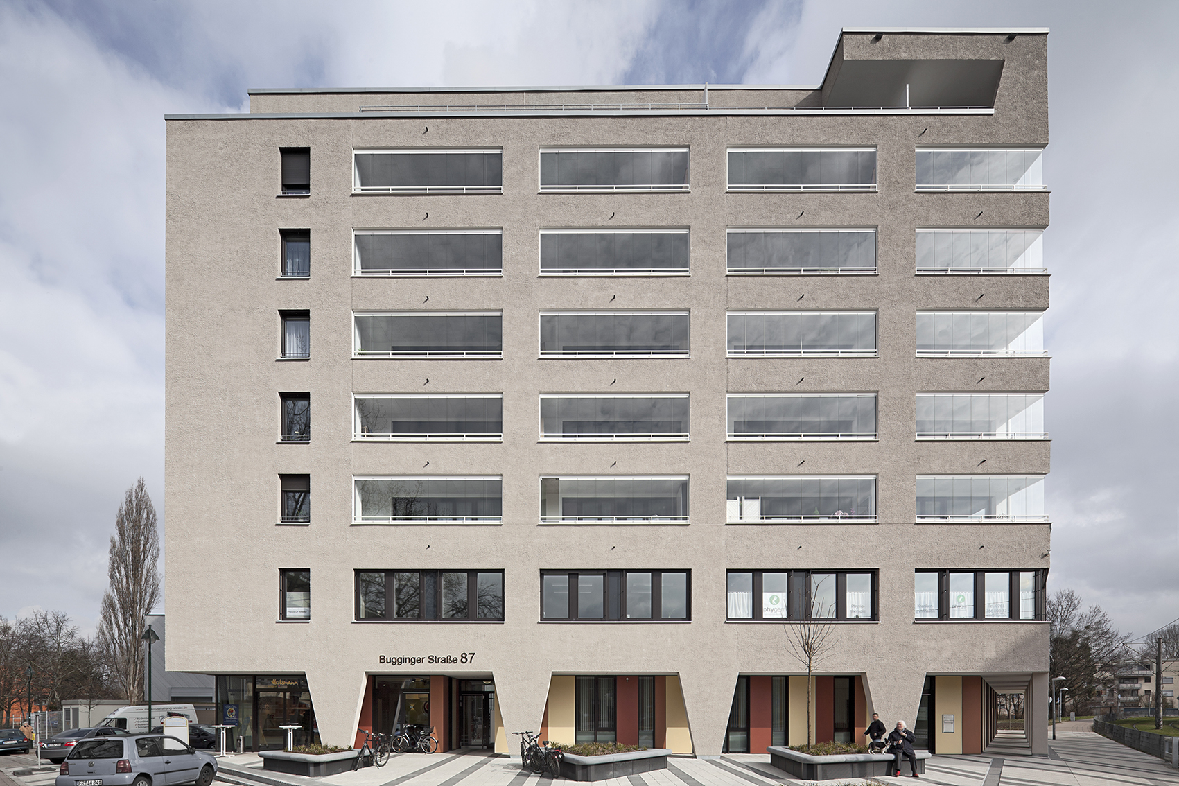 Ein markanter Gebäudekopf an einer verkehrsreichen Straße mit Straßenbahn in Freiburg Weingarten. Dem Hochbau ist eine großzügige Platzanlage mit Straßencafe vorgelagert. In den verkehrsbelasteten ersten beiden Geschossen finden sich Geschäfts- und Büroflächen, wärend die Geschosse des Turmbaus, Wohnungen vorbehalten sind. Ein hochwertiger Baustein der Freiburger Stadtbau GmbH in der Großsiedlung Weingarten.